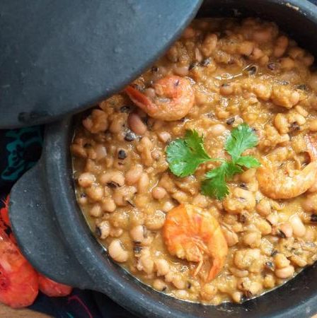 A receita que teremos aqui é a do feijão fradinho baiano, onde esse feijão é cozido com temperos frescos, azeite de dendê e camarões secos.