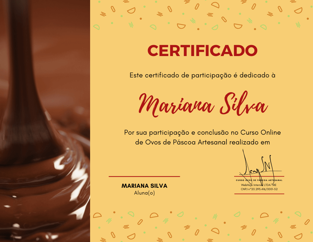 Após concluir o Curso Ovos de Páscoa Artesanal você irá Baixar um Maravilhoso Certificado direto de sua Área Restrita do Curso.